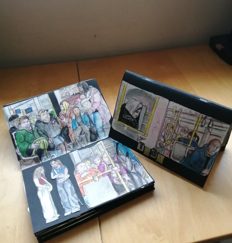 I draw in black ballpoint pen in a little book for about 20 minutes each, then add colour at home with watercolour pencils.