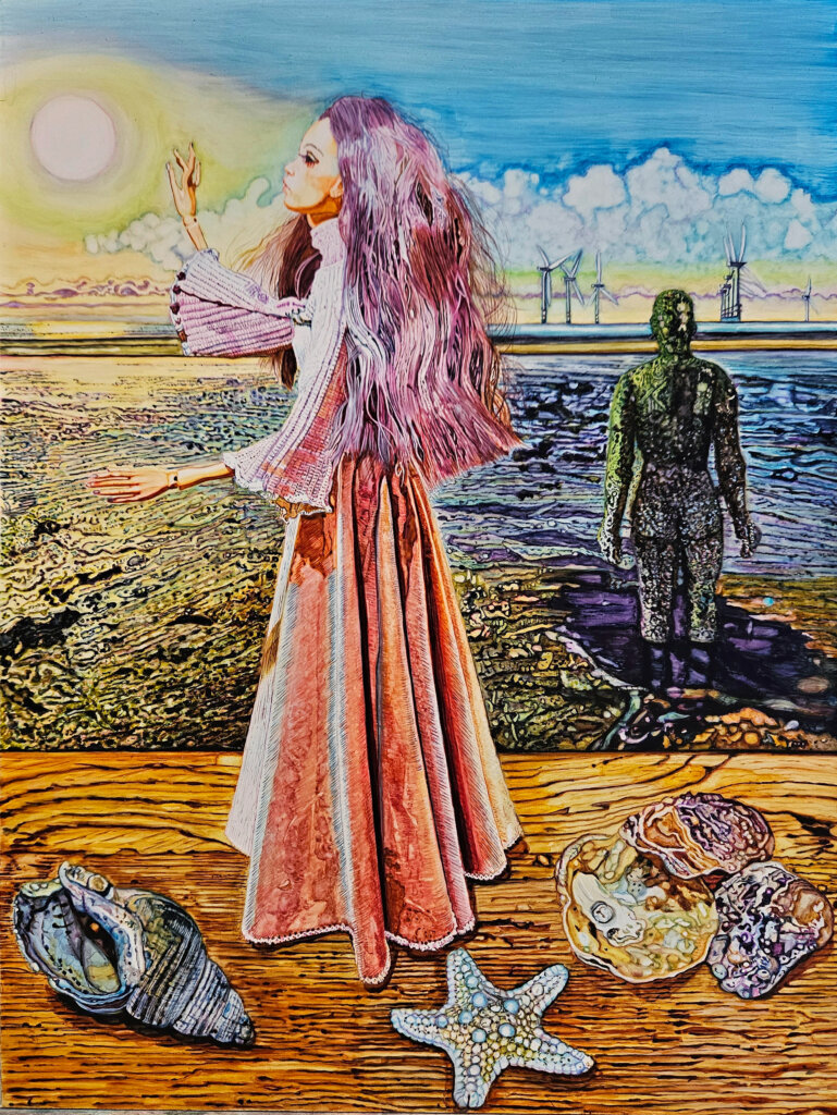 The myriad references coalesce within the studio to create a dual space, one that is both physical and psychological. Hancock merges still life and the imagination, creating a self-contained subconscious world within a single painted plane, where there is room for exploration of an un-gendered liminal space.