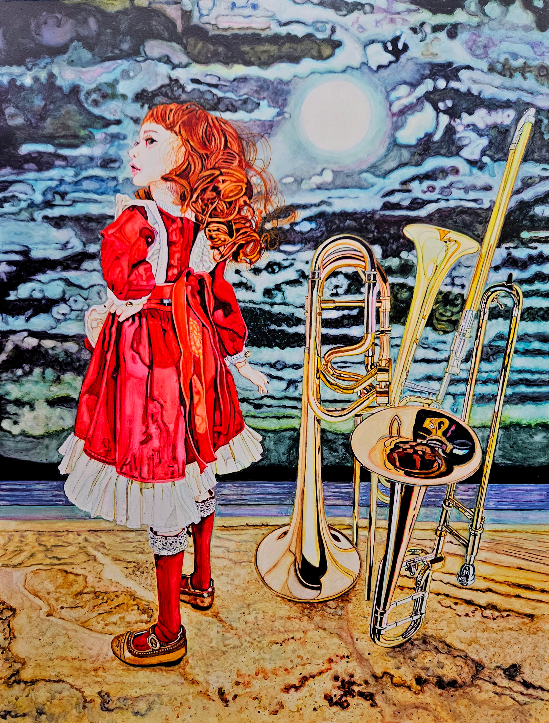 The myriad references coalesce within the studio to create a dual space, one that is both physical and psychological. Hancock merges still life and the imagination, creating a self-contained subconscious world within a single painted plane, where there is room for exploration of an un-gendered liminal space.