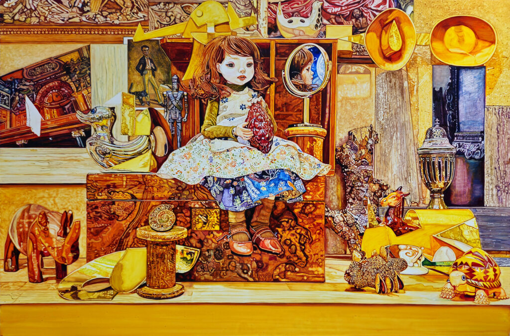 The paintings of David Hancock depict an uncanny space, a world poised between the real and the surreal, both tangible and illusory. Positioned centrally in the work, dolls are a recurring motif. They function as both a portrait of the chosen artist and as a means for Hancock to navigate the still life. It is not necessary that they resemble the chosen artist. They are explorations of self, a non-binary avatar aligned to Hancock’s own personality, tastes, and memories. The dolls are a form of drag. Purchased as blanks, their persona is determined over the course of their transformation. In this process, the doll becomes as ‘real’ as any human sitter and blurring gender, they offer a way for Hancock to inhabit the painting both as the artist and subject.