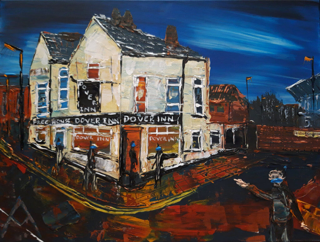 I lived and worked in Salford 5 Pentlands Avenue for 18 years near this local public house. Its a traditional Salford pub and as the area has been regenerated around it, it is a reminder of the past with lots of history. I produce my work with influences from L.S Lowry characters in my modern style.