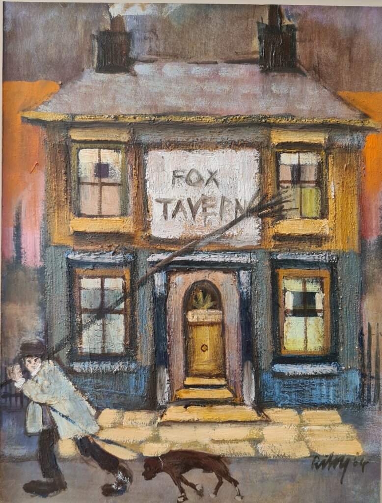 Fox’s Tavern, oil on board, depicts a Knocker Upper, with his Boxer dog who doesn’t look best pleased about the early morning start! This painting was in a Canadian collection and has eventually made it’s way back to North West England.