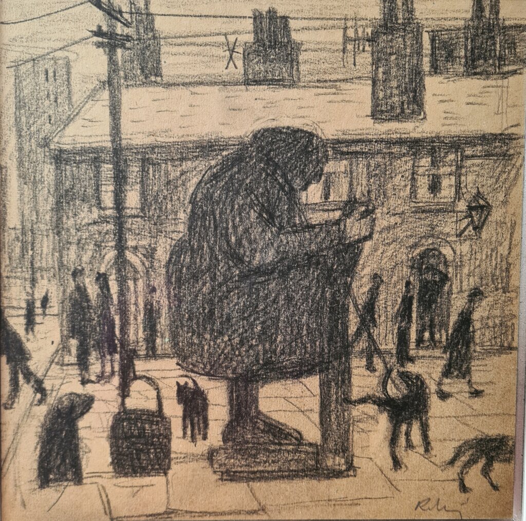 This is the Dog Lady, charcoal on buff paper and is one of our favourites, exhibited along side LS Lowry in a joint exhibition in Harrogate. Shows a lady on a public weigh scales, with a cheeky dog cocking it’s leg!