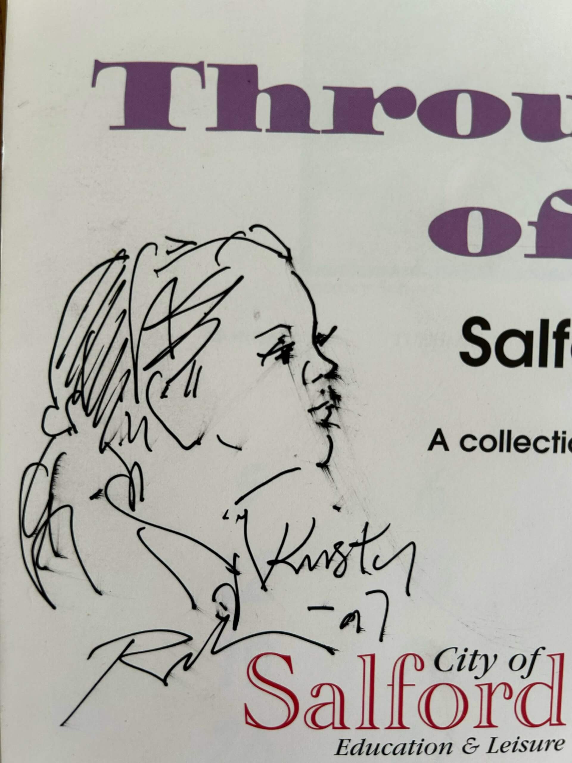 I met Harold Riley on the 24th November 1997. Myself and a classmate had taken part in the ‘Through the Eyes of a Child calendar’ that year and were chosen as one of the winners. We went to Salford Museum and Art Gallery at Peel Park and Harold did a sketch of me on my calendar.