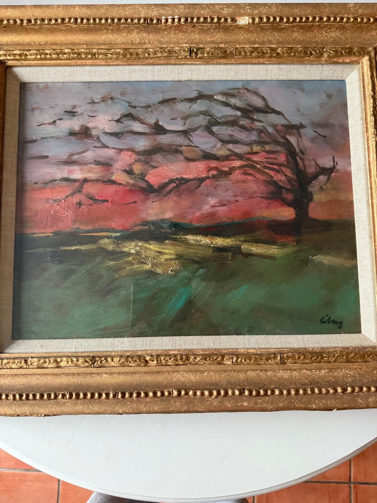 We have the provenance for the oil, named The Tree and dated 1964. This oil was painted in 1964 and depicts a tree at sunset on Saddleworth Moor being blown by the wind.