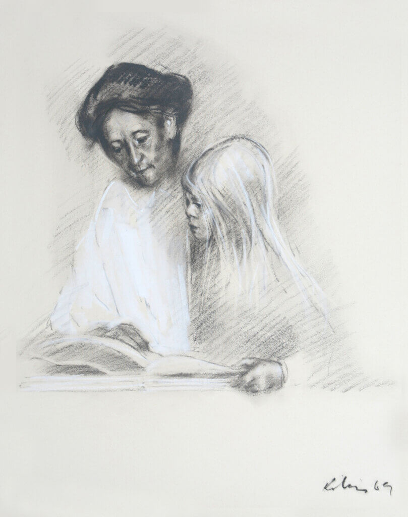 ‘A family carol concert was held in the Library Theatre, a pageant of fashion ‘A Lark on th’ill’ at the Salford Art Gallery and a service for social workers at the Cathedral. Three lectures on social work were arranged at the Library Theatre. Harold Riley, the Salford artist, generously gave us a pastel drawing ‘Old Lady and Girl’ and a limited edition of prints of the drawing. A reproduction of the drawing appeared on the Halle concert programme. We shall be glad to lend a framed print to our member bodies.’