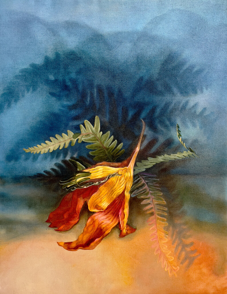 Olha Pryymak is drawn to the mythical phoenix and its cycle of burning to cinders then rebirthing in its full splendour. She sees Elisabeth Frink’s Harbinger Bird as a portentous omen, in opposition to this cycle. The intensified threats of nuclear disaster in the media trigger associations with Pryymak’s birthplace of Ukraine and the Chernobyl disaster of the 1980s. Still irradiated after 40 years, plants and animals flourish in abundance. In her painting, the date palm (Latin name: Phoenix dactylifera) is a substitute for the phoenix, as the plant requires fiery temperatures of more than 50°C above ground to bear fruits. The date palm was the keystone species of Middle Eastern and North African civilization, providing food and shelter for many creatures and people for millennia.