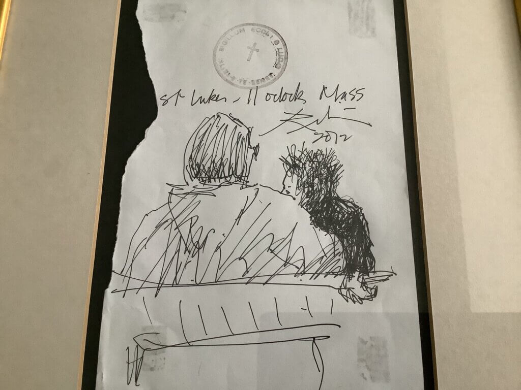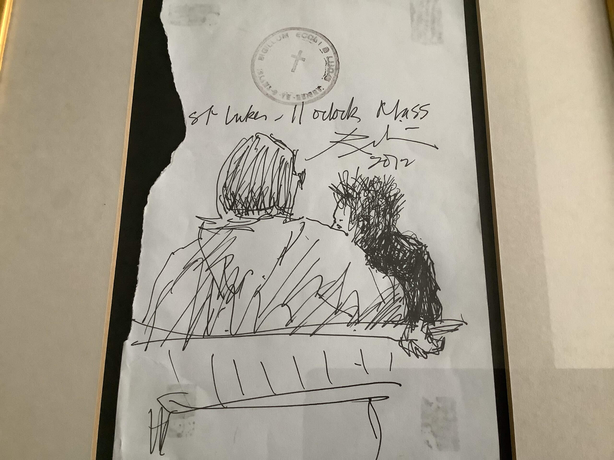 This is a sketch Harold Riley did of me and my firstborn grandchild Aidan. It was drawn on a blank page out of the hymn book at St. Luke’s RC Church which my family and Harold attended regularly.