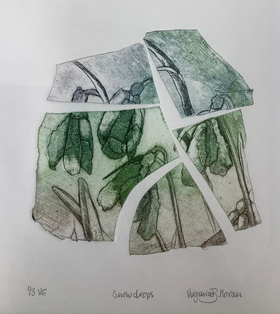 This is a piece l produced during the first lock down. I wanted to use recycled materials. The printing plate is made from a shattered CD case representing our separation during restrictions but that we are still united. Snow drops from a sketch l made just before lock down on my last trip away with friends.