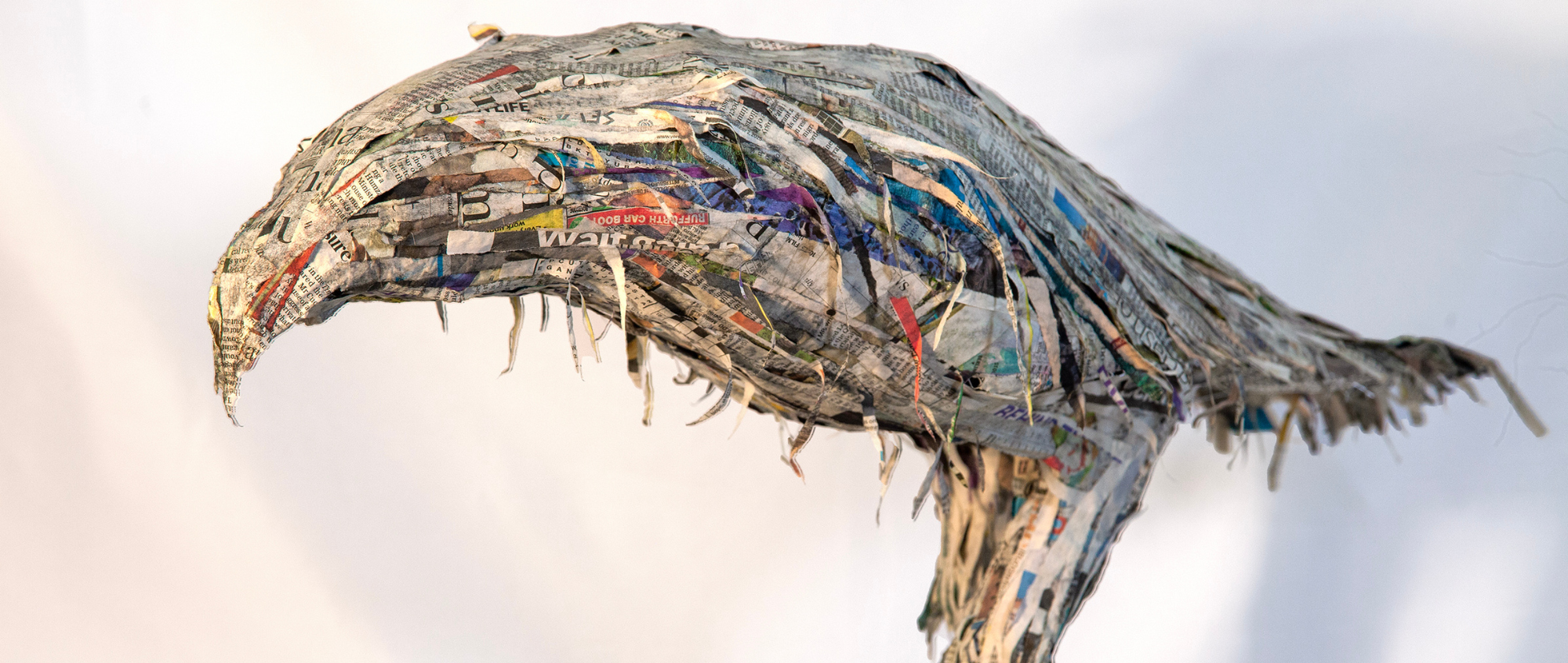 A series of new sculptures focus on consumer waste and environmental impact. ‘Sirins’, sculptural birds made from papier mâché newspaper headlines, take their name from a Slavic mythical bird-woman who lures men to their deaths. In mythology and folklore throughout the globe, birds feature as symbols of war, wisdom, wealth, prosperity, death, rebirth, virtue, patience and protection. This variety of meanings make them ideal characters to carry mixed messages about equality, freedom of speech and environmental catastrophe – as they are often expressed by newspapers.