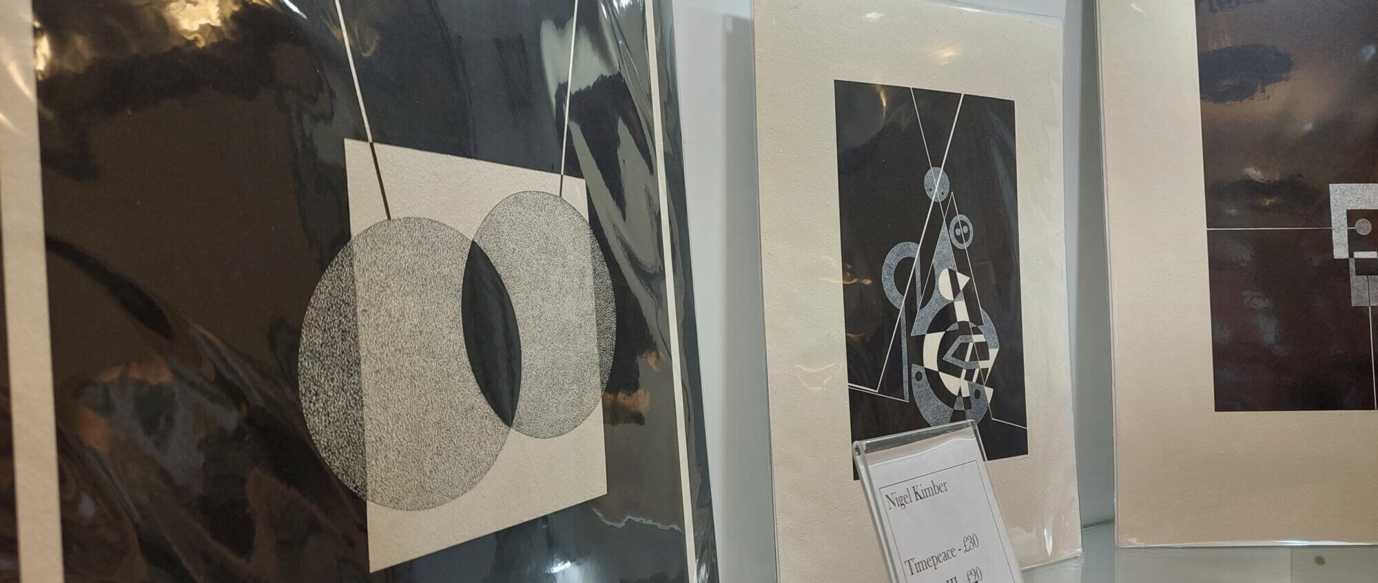 Nigel Kimber’s work comprises abstract, monochrome compositions created using lines, geometric forms and shading. Interlaced and overlapping geometric forms and shapes are arranged to give the impression of captured movement or a precarious balance of unstable elements. A stippling technique, using very fine technical drawing pens with black and white ink, is used to produce shading. This creates the impression of transparent, superimposed layers and a textured appearance in contrast to the opaque elements of the design.