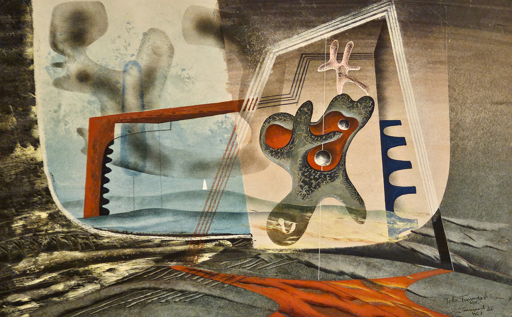 Tunnard’s early works were fairly conventional landscapes and marine scenes but from the mid 1930s his style became more abstracted and on reading Herbert Read’s book Surrealism, his work moved dramatically away from traditional figuration. Whilst Tunnard never formally joined the surrealist movement, he did participate in several of the group’s exhibitions.