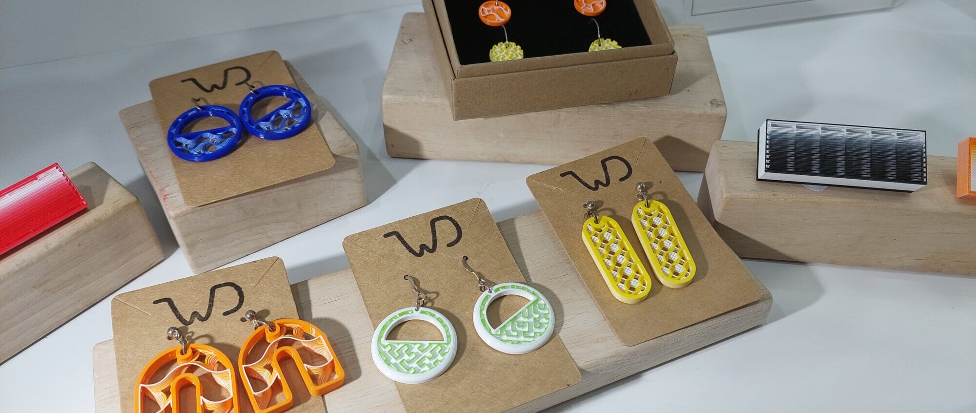 Due to her 3D printer having one nozzle for the material to come out, it means the colour needs to wipe from one colour to the next. For example, from white to red. This colour change creates an ombre wipe tower that is usually considered a waste product. However, Jamie has incorporated the process of wiping the ombre colour into 3D printed shapes to create unique patterns and textures. Due to the multicoloured ombre effect, she never knows how they will come out. Each multicoloured 3D printed pattern is unique and won’t be reprinted!