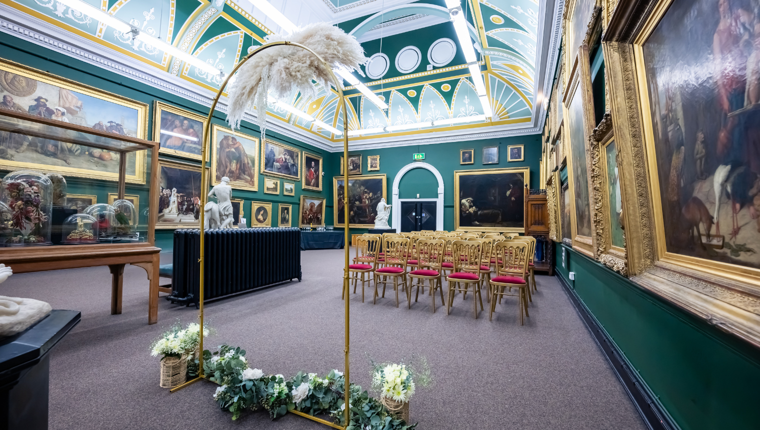 • A beautiful private ceremony space in our Victorian Gallery for up to 30 guests dressed with banqueting chairs and floral arch.